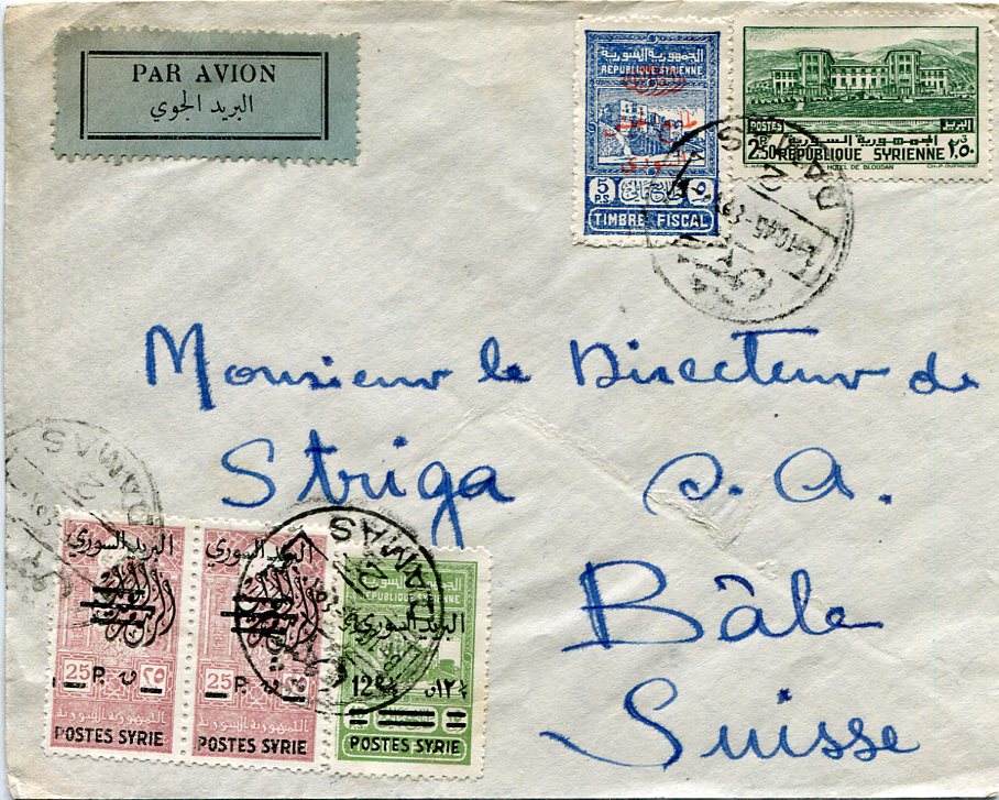 Syria: 1945 (3 October). Airmail cover to Switzerland franked with pair of 25p on 25s and 12 1/2p on 15p surcharged fiscal, 2p50 pictorial and 5p Syrian Army Fund obligatory tax stamps tied by Damas 2 datestamps. Reverse blank. Sg. 347, 415, T424