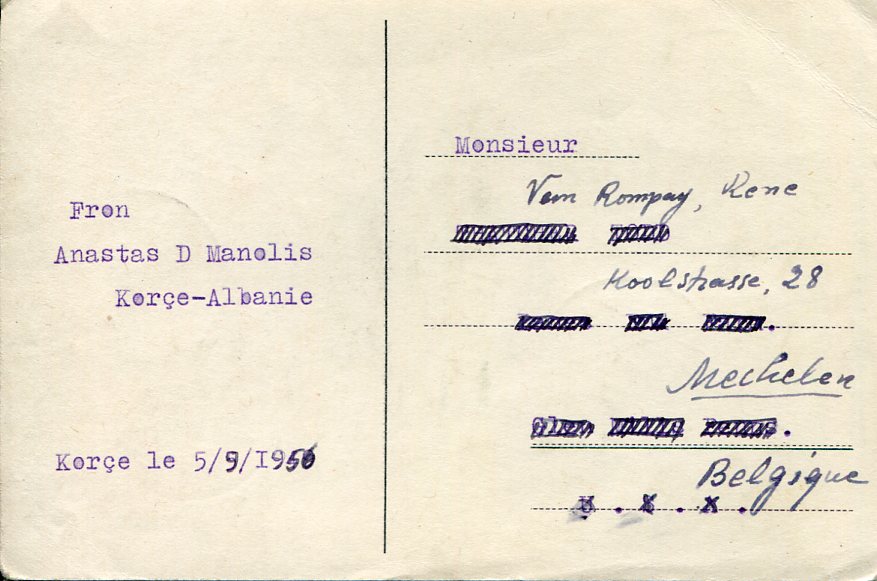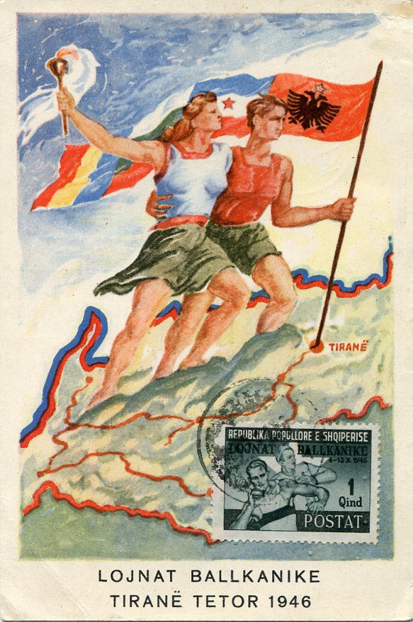 Albania: 1946 Balkan Games commemorative postal card franked with 1q and addressed to Belgium tied by Korce datestamp dated 5/9/1956 on reverse. Sg. 458