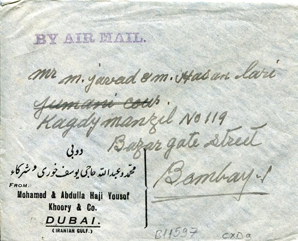 Trucial States – Dubai: 1946 (May). Airmail commercial cover to India franked on reverse with 1/2a and two 1a KGVI Indian stamp tied by Dubai (donaldson type 5) datestamp and 19 May Bombay Delivery boxed arrival ds. Sg. 266, 268