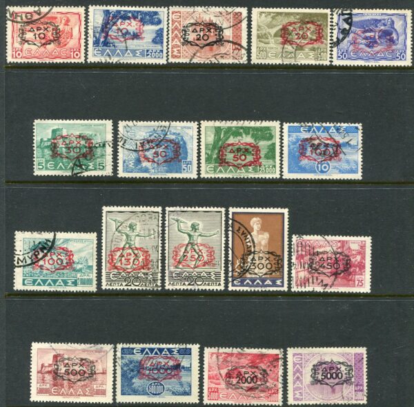 Greece: 1946 (10 February) – 47. Chains surcharges on Landscapes issue used set. Sg. 622/639, Hellas 640/657.