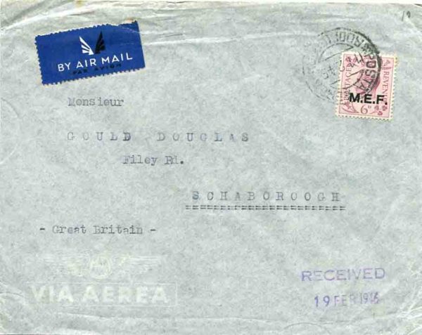 British Occ. of Italian Colonies: 1946 (11 February). Cover from Rhodes, Greece to Scarborough, England franked with 6d M.E.F. overprinted Great Britain stamp tied by  POSTA AEREA * RODI EGEO date stamp. 19 February receivers handstamp on lower right. Reverse no postal markings.