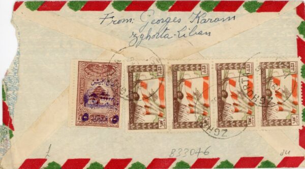 Lebanon: 1946 (19 December). Cover to Albany, United States franked with strip of four 12p.50, 10p on two 20p (one damaged) National Flag stamps and 5p. on 30c, Lebanese Army postal tax tied by ZGHORTA datestamps. Roughly opened.