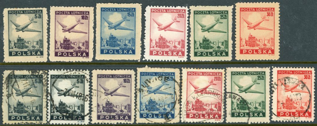 Poland: 1946 (March – November). Lisunov Li-2 over Warsaw airmail mint o.g. and used sets with additional 5z. slate-black used. Sg. 555/560, 555a. *