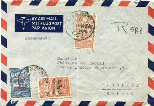Syria: 1946 (25 June). Registered cover to Switzerland franked with 25p and 50p on 75p overprinted fiscal stamps and 5p Syrian Army Fund obligatory tax stamp tied by Damas datestamps. Reverse 3 August Lausanne arrival cds. Sg. 410, 411, T425