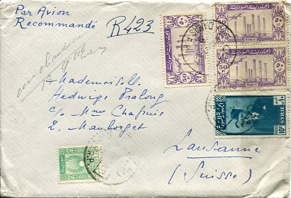 Syria: 1946 (31 August). Registered cover to Switzerland franked with 5p, 10p postage, single and pair of 50p airmail stamps tied by Damas datestamps. Reverse 5p Syrian Army Fund obligatory tax stamp and 12 & 13 September Lausanne arrival cds’s. Sg. T422, 423, 425, 439