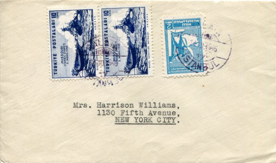 Turkey: 1946 cover from Istanbul to New York, USA franked with pair of 10k USS Missouri and 2k National Defence obligatory tax stamps. Isfila 1537