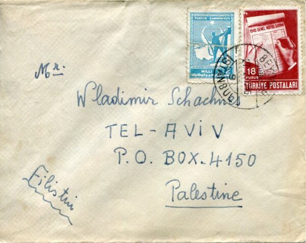 Turkey: 1946 (27 February). Cover addressed to Tel Aviv, Palestine franked with 18k National Census commemorative and 2k National Defence obligatory tax stamps tied by Beyoglu, Istanbul datestamp. Reverse no postal cancellations.
