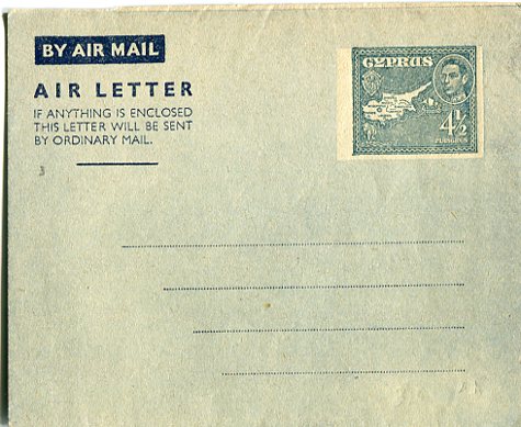 Cyprus: 1947 King George VI  4 1/2pi unused air letter. I&P 5