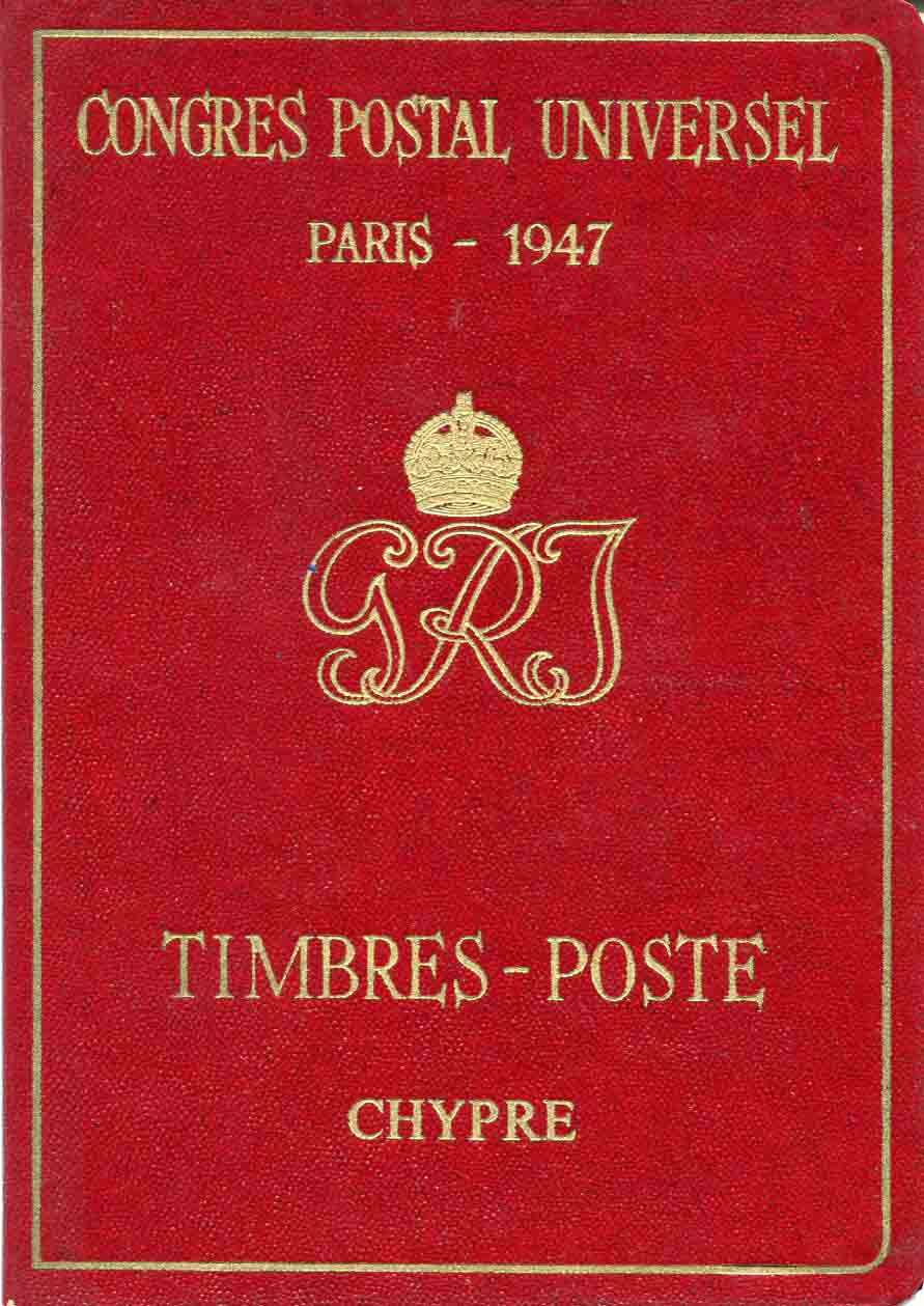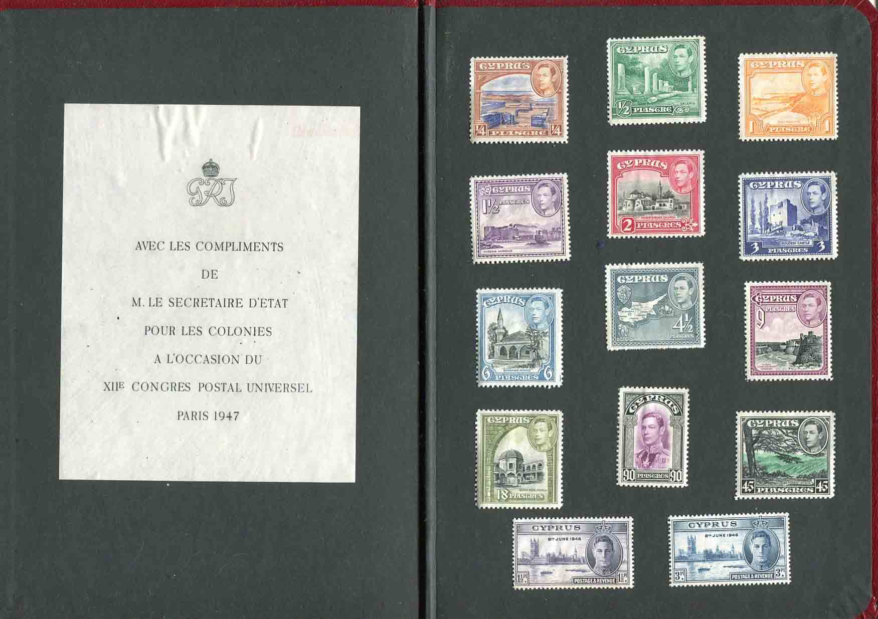 Cyprus: 1947 UPU Paris Congress booklet containing KGVI pictorial issue of 1938 to 90pi and Victory set. SG 151/162 (between), 164/165