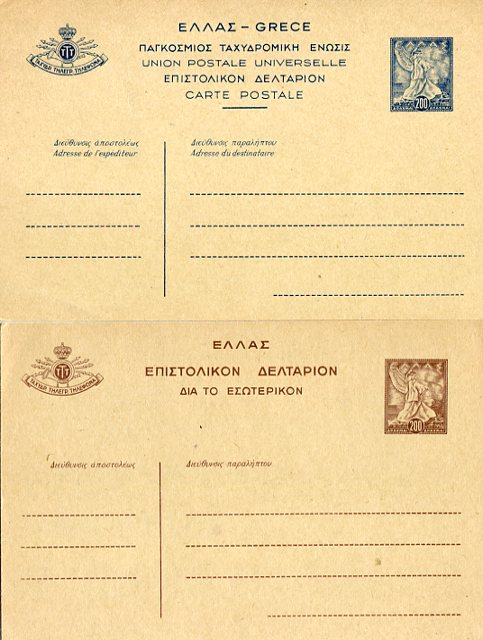 Greece: 1947 (1 April). Glory second issue unused 200d postal stationery cards. Karamitsos PC63/64