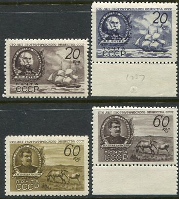 Russia – USSR: 1947 (27 January). Geographical Society unmounted mint set. Mi. 1088/1091, Sg. 1237/1240, Zagor. 1018/1021
