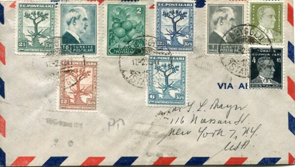 Türkiye: 1947 (17 February). Airmail cover to United States franked with 2 1/2k, 6k, 12k, 12 1/2k Second Balkan Conference of 1931 commemorative and definitive stamps tied by Beyoglu-Istanbul datestamps. Reverse 2k thick paper National Defence obligatory tax stamp and 28 February arrival cachet. Very late usage.
