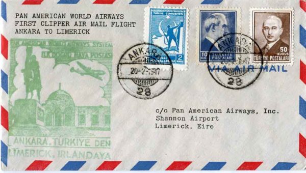 Turkey: 1947 (20 February). Pan American clipper first airmail flight cover to Limerick, Ireland