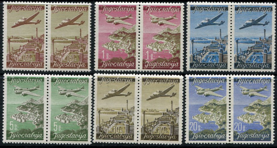 Yugoslavia: 1947 Ilyushin aeroplanes and views horizontal pair airmail unmounted mint set. Mi. 515/520, Sg. 546/551b. **