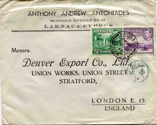 Cyprus: 1948 (29 July). Commercial cover to England franked with 1/2pi and 1 1/2pi of KGVI stamps and tied by LARNACA date stamps. Censored in Egypt. Reverse no postal markings.