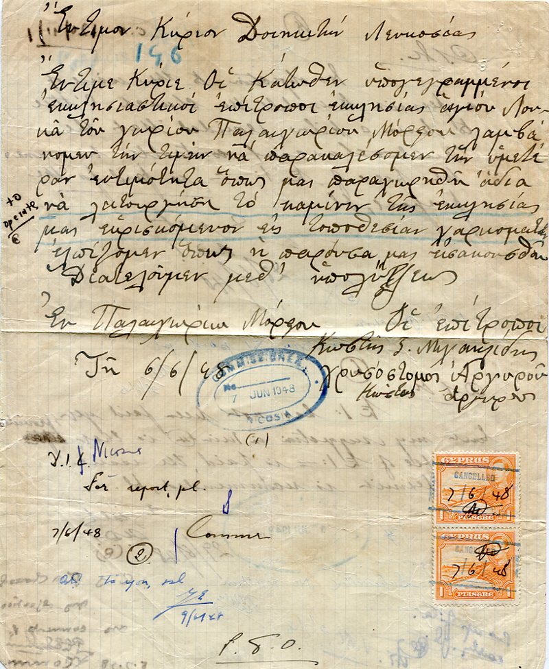 Cyprus: 1948 petition franked with pair of 1pi of KGVI with cancelled and Nicosia Commissioner hand cachets.