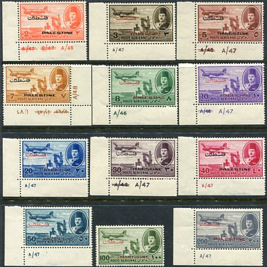 Palestine: 1948 (1 June). Egyptian Occupation of Gaza Palestine overprinted Airmail unmounted mint set of 12, except 100m all with control numbers. Very scarce. Sg. 20/31. **