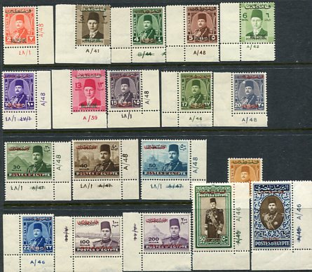 Palestine: 1948 (1 June). Egyptian Occupation of Gaza Palestine overprinted unmounted mint set of 19, except 1m all with control numbers. Very scarce. Sg. 1/19. **