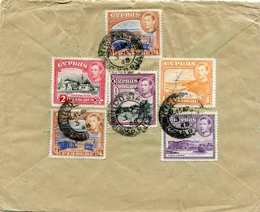 Cyprus: 1948 (3 May). Commercial airmail cover from a Turkish Cypriot to Switzerland franked on reverse with total of 14pi of KGVI stamps and tied by NICOSIA date stamps.
