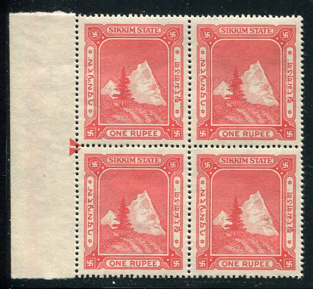 India – Revenues: Post 1948 Sikkim State revenues 1r marginal block of four mountain and swastika design unmounted mint. **