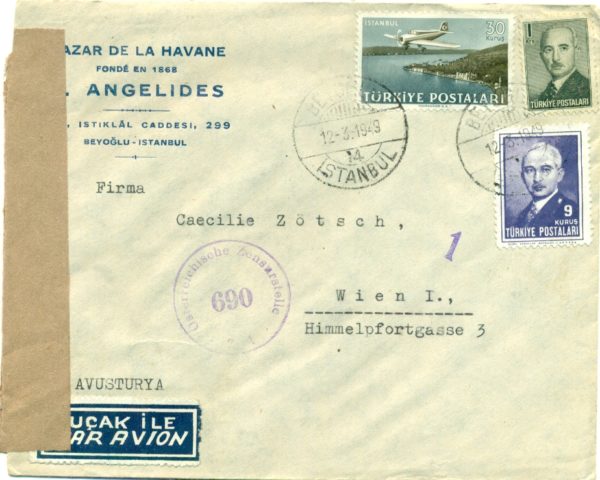 Turkey – Republic: 1949 (12.3) Commercial cover to Austria with multiple franking includes a 30k Airmail Stamp tied by dispatch date stamps and violet censor cachet. Reverse no postal markings. Isfila 1584