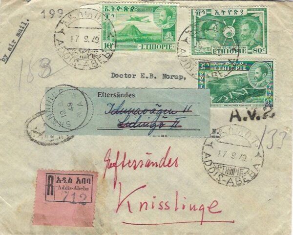 Ethiopia: 1949 (17.9.) registered cover to Sweden franked 5c., 10c. and 80c. tied Addis-Abeba cds, the 5c also tied by clear A.V.2 handstamp, envelope redirected with label tied Skanninge cds, reverse with Lidingo 2 cds.