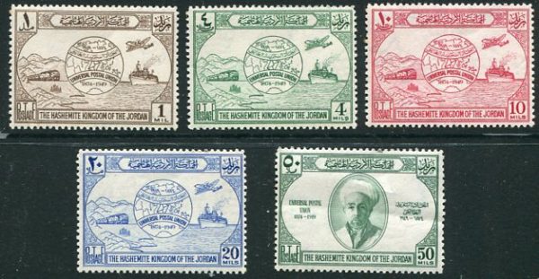 Jordan: 1949 (1 August). Universal Postal Union UPU Anniversary unmounted mint set. Sg. 285/289