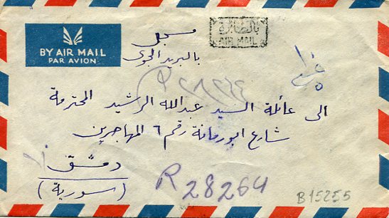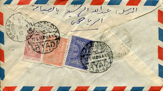 Saudi Arabia: 1949 (12 June). Registered cover to Syria franked with 3g and 5g perf. 11 definitive and 1/8g Medical Aid Society charity stamps tied by superb RYAD datestamp, 15 June Djeddah transit and 20 June Damas arrival cds’s. Sg. 336Ba, 338B