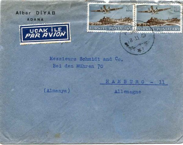 Turkey: 1949 (8 November). Commercial airmail cover to Germany franked with pair of 20k Aeroplane over Ankara airmail stamps and tied by ADANA datestamp. Reverse no postal marking. Isfila 1583