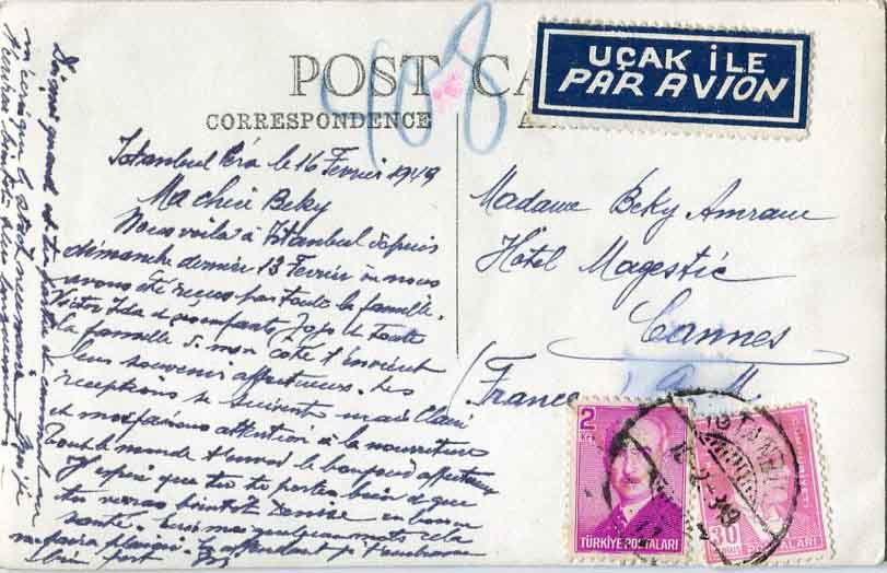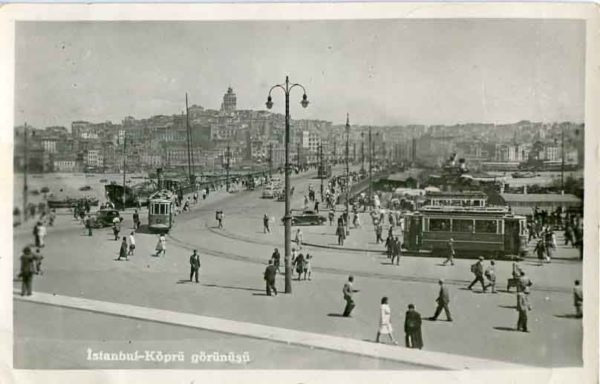 Turkey: 1949 photocard of Galata Bridge, Istanbul to France by airmail franked with 30pa Ataturk and 2pi Inonu definitives tied by Istanbul 11 datestamp.