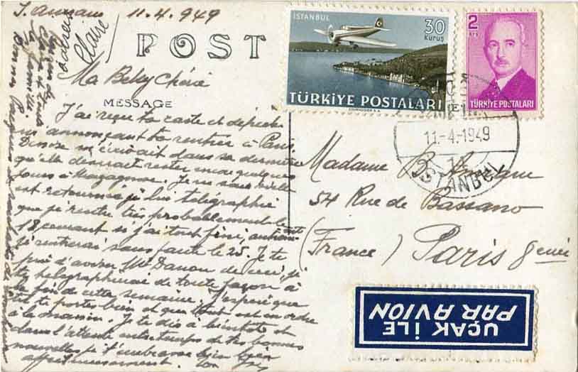 Turkey: 1949 (11 April). Photocard of Büyükada – Prinkipo by Nizam, Istanbul to France by airmail franked with 2k Inonu definitive and 30k Airmail stamps tied by Beyoglu – Istanbul datestamp.