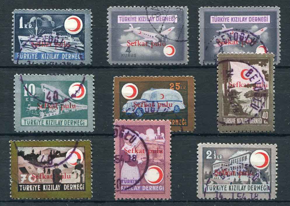 Red Crescent: 1949 Turkish Red Crescent Association Charity overprinted issue used set of 8 with additional 4k. Isfila K85/K92