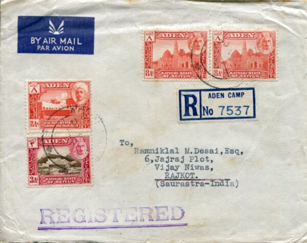 Aden – Kathiri State of Seiyun: 1950 (20 April). Registered cover to India franked with 3a and two 8a Tarim and Seiyun pictorials and 8a Qu’iti Shihr and Mukalla, all tied by Aden datestamps. Reverse same day transit and 22 April Rajkot arrival cds’s.