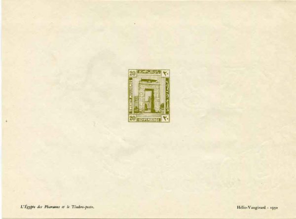 Egypt: 1950 Helio-Vaugirard Proof of the 1921 pictorials 20m Archway of Ptolemy III, Karnak with inscription, ‘L’Egypte des Pharaons et le Timbre-poste’ at left and ‘Helio-Vaugirard – 1950’ at bottom right. Very fine. Sg95