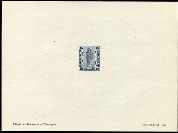 Egypt: 1950 Helio-Vaugirard Proof of the 1922 pictorials 15m Statue of Rameses II, Luxor with inscription, ‘L’Egypte des Pharaons et le Timbre-poste’ at left and ‘Helio-Vaugirard – 1950’ at bottom right. Very fine. Sg93