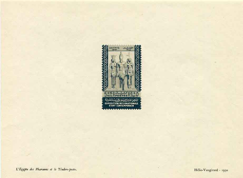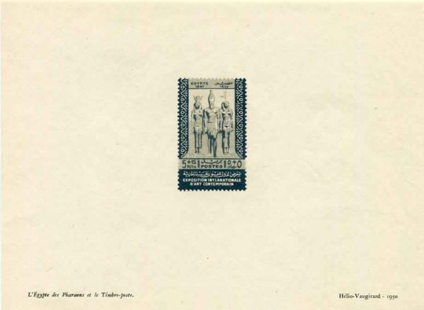 Egypt: 1950 Helio-Vaugirard Proof of the 1947 25th International Exhibition of Fine Arts 5m + 5m grey with inscription, ‘L’Egypte des Pharaons et le Timbre-poste’ at left and ‘Helio-Vaugirard – 1950’ at bottom right. Very fine. Sg334