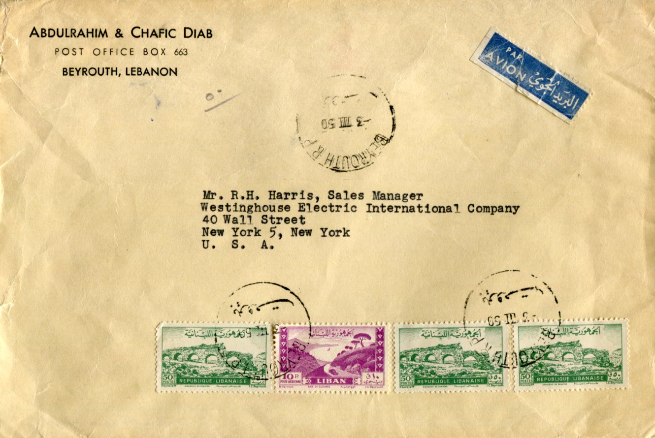 Lebanon: 1950 commercial large cover to United States franked with 10p Jounieh Bay and three 50p Zebaide Aqueduct pictorial stamps tied by Beyrouth datestamps. Reverse blank. Scarce high value envelope. Sg. 343, 372