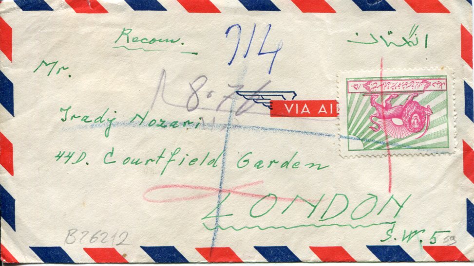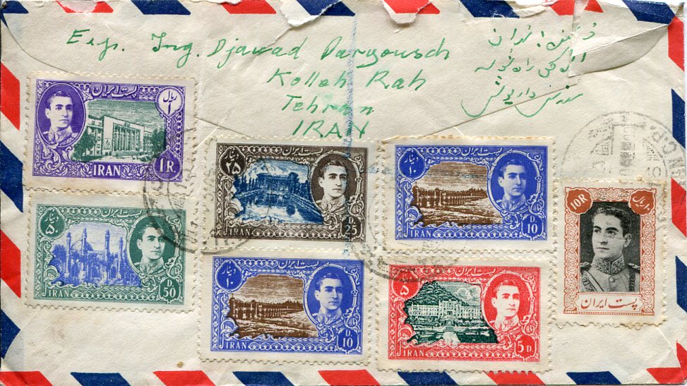 Iran: 1950 cover to England franked with 5d., two 10d., 25d., 50d. and 1r. buildings and 10r. Riza Pahlavi portrait stamps tied by Abadan datestamps. On front 50d Hospitals Fund postal tax cancelled by crayon.