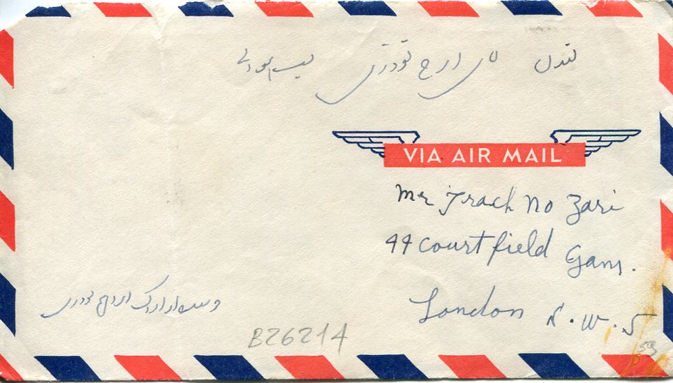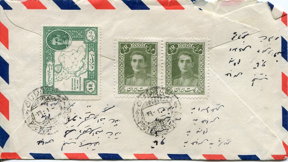 Iran: 1950 cover to London, England franked with 5r. Map of Iran and pair of 2r. Riza Pahlavi portrait stamps tied by POSTES BAZAR ARAK datestamps, forwarded and to Earls Court and received 12 July arrival cds.
