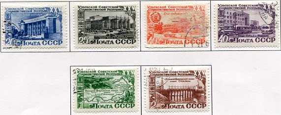 Russia – USSR: 1950 Foundation of Uzbek Socialist Republic used or CTO set of 6. Zagorsky 1397/1402