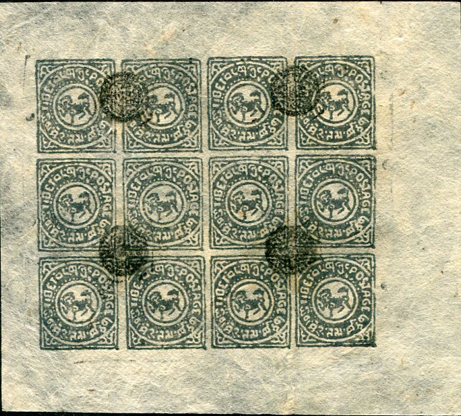 Tibet: 1950 type 1t. grey imperforate sheetlet of 12 struck by four cancels. SOLD AS FORGERY