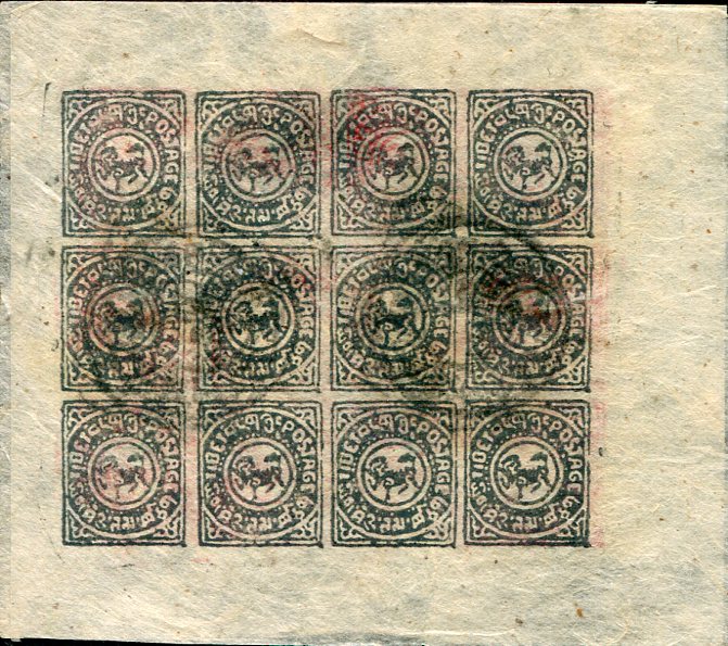 Tibet: 1950 type 1t. grey imperforate sheetlet of 12 struck by two cancels. SOLD AS FORGERY
