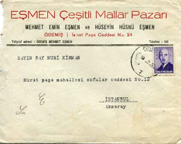 Turkey: 1950 (19 February). Commercial cover to Istanbul franked with 15k Inonu definitive and tied by ÖDEMIS (district of Izmir) datestamp. Reverse 21 February Aksaray arrival cds.