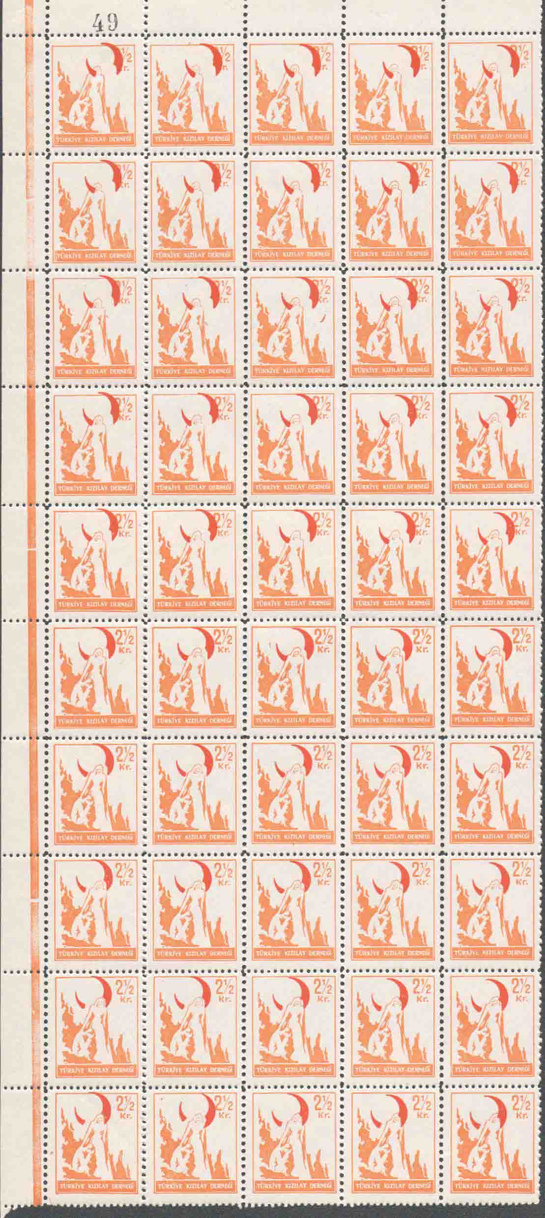 Turkey – Red Crescent: 1950 Turkish Red Crescent charity stamps 2 1/2k unmounted mint marginal block of 50 with top 25 stamps half moon error. Spectacular exhibition piece. Isfila K96