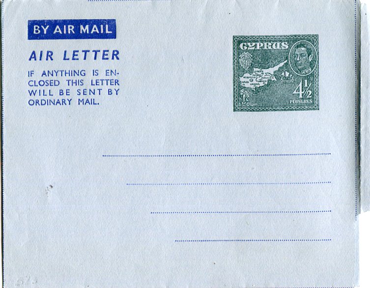 Cyprus: 1951 King George VI 4 1/2pi unused air letter. I&P 10