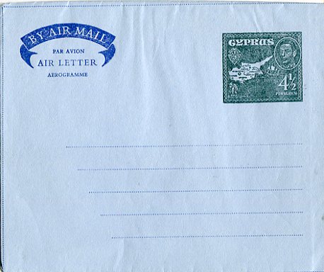 Cyprus: 1955 King George VI 4 1/2pi unused air letter. I&P 12