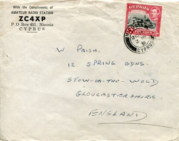 Cyprus: 1951 (2 March). Amateur Radio Station ZC4XP imprinted cover to England franked with 2pi KGVI pictorial tied by Nicosia datestamp. Reverse blank.