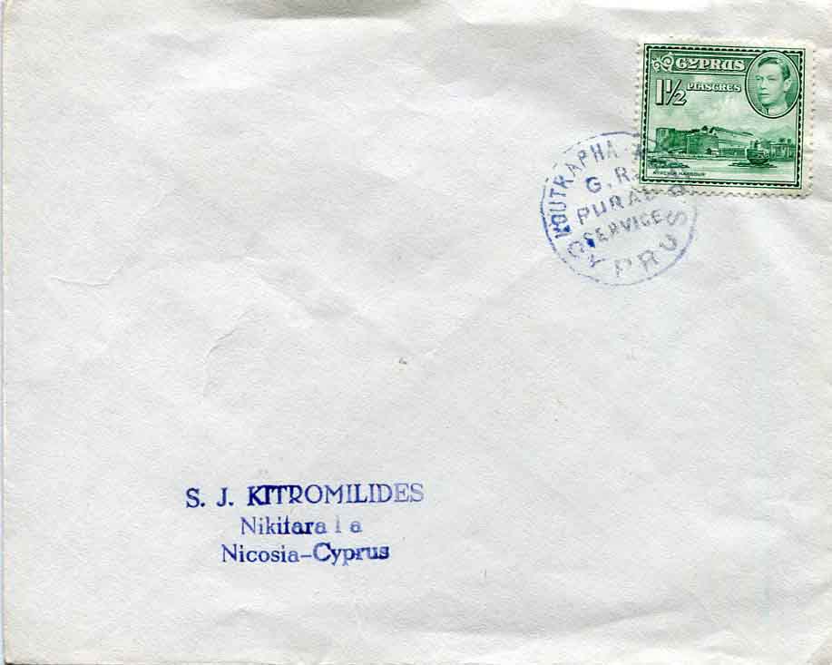 Cyprus: circa 1951 cover franked with 1 1/2pi KGVI pictorial and tied by KOUTRAPHA KATO G.R. Rural Service handstamp. Philatelic but scarce.