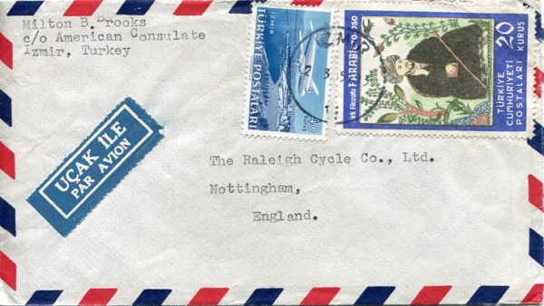 Turkey: 1951 (2 March). Airmail cover from American Consulate at Izmir to England franked with 40k airmail and 20k Al-Farabi commemorative stamps. Isfila 1585, 1634