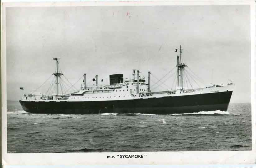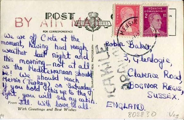 Turkey: 1951 picture postcard of m.v. “SYCAMORE” cruise ship to England franked with Ataturk definitives tied by Mersin datetamp and large UCAK ILE – AIRMAIL handcachet.